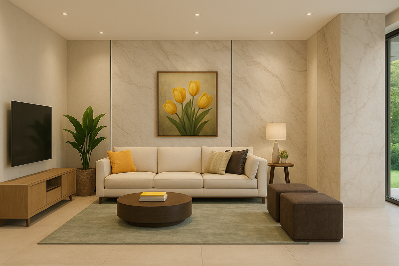 Ruang tamu: Panel dinding HPL motif marmer dapat menjadi focal point yang elegan tanpa terasa berlebihan.